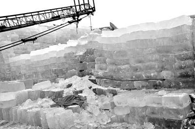 这是堆积起来的冰块(1月19日摄)。每逢腊月,大连杏树屯渔港附近的村民都要将从河里或水库里采集来的冰堆在一起,盖上苫布、稻壳及草帘子储备起来,等到开春以后,尤其是夏天,渔船捕鱼时用于冰冻鱼虾。当地有关人士介绍,“囤冰”最长可以存放3年。今年计划储备3万吨天然冰,目前已经采集了近2万吨。