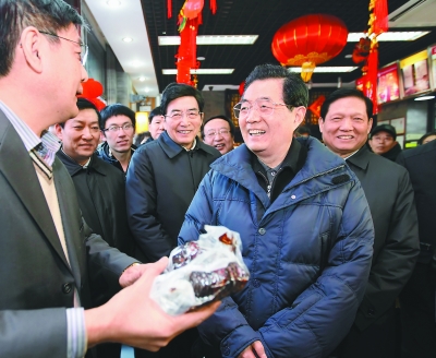 总书记步行在前门商业街上,不时停下脚步,同正在购物、游览的群众打招呼,祝大家欢欢喜喜过大年。商业街上汇聚了20多家老字号商铺,胡锦涛走进有270多年历史的天福号酱肉店,了解这家老店的发展历程、制作技艺和节日营业情况。总书记对店员们说,你们店之所以270多年长盛不衰,就在于秉持了“诚信为本、品质是天”八个字。希望你们珍惜老字号,弘扬好传统,追求高品质,更好为广大顾客服务,让老店焕发出新的生机。胡锦涛祝天福号龙年生意更加兴隆。