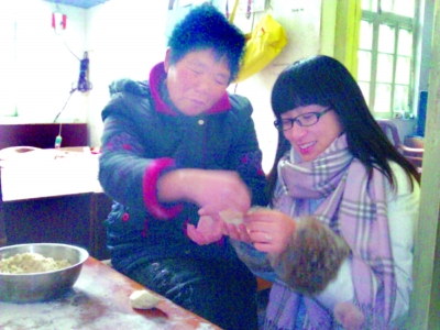 | 1月18日,本报记者詹媛(右)和崔大娘在村医张俊锋家捏“贡样”。 陈伟摄 |