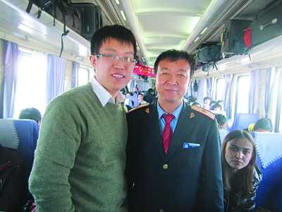 | 1月17日,在T69次列车上,本报记者杜羽(左)和列车员艾再孜在一起。 谷鹏城摄 |