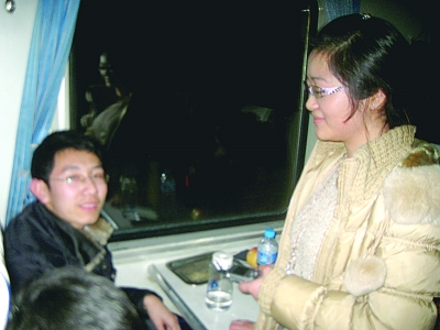 | 1月14日,本报记者龚亮(右)正在K603次列车上采访。 范鹏飞摄 |