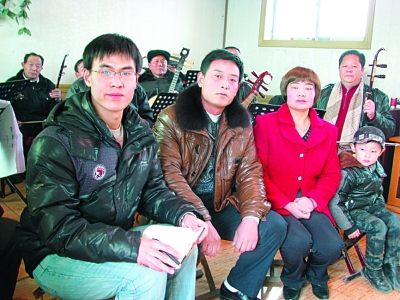 | 1月19日,本报记者韩业庭(左一)在山东临沂市河东区常庄村采访当地的凤凰戏曲票社。夏洪雷摄 |