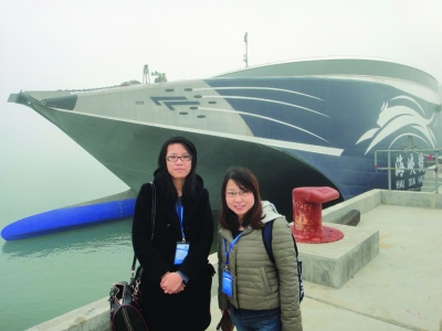 | 1月19日,本报记者柴如瑾(右)、潘睿在福建平潭澳前码头“海峡号”高速客滚船前采访时合影。于歌摄 |