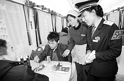 1月22日,在北京西开往汉口的Z77次列车上,列车长李景娥和餐车长张继红,为旅客送上饭菜后征求旅客的意见。除夕之夜,列车上的司乘人员依然坚守在运输岗位。 本报记者 郭俊锋摄