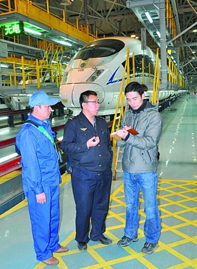 | 1月11日,本报记者焦健(右)在动车检修基地采访夜间列车检修工作。 赵金辉摄 |