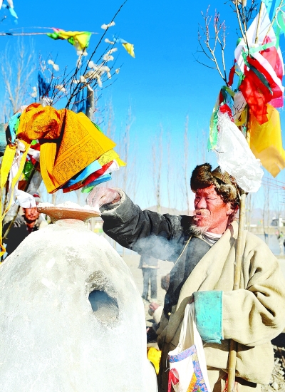1月26日,西藏日喀则市曲布雄乡顶村农民边巴在土地庙烧香敬“切玛”。当日是藏历12月3日,是西藏日喀则农家新年初三,当地农牧民群众按照传统习俗,在屋顶、山顶、水边、土地庙等地插起五彩经幡,向土地神敬吉祥的“切玛”(即五谷丰斗),全村人聚在一起,一边畅饮青稞美酒和酥油茶,一边唱酒歌跳“果谐”舞,以此祈求新的一年里无灾无祸、风调雨顺、农牧业继续获得丰收。新华社记者 索朗罗布摄