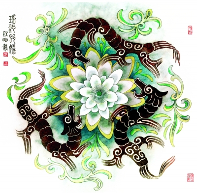 国画《瑶池虬嬉》是根据虬龙造型创作的。前人对没有生出角的小龙称为虬龙,古文献中注释:“有角曰龙,无角曰虬。”另一种则说幼龙生出角后才称虬。两种说法虽有出入,但都把成长中的龙称为虬,角成了区别虬的标志。古书《抱朴子》则有这样的记载:“母龙称为蛟,子龙称为虬。”不管怎么说,虬是成长中的子龙。