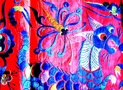在古代,龙一般是皇权的象征,代表了天子威严,而到了苗族地区,就不一样了。在苗族人民眼里,龙并不是那么威严,家家户户都可以把龙纹绣制在自己的衣服上,龙的形象多样,有鱼龙、鸟龙、蚕龙、猪龙、象龙、蛙龙甚至双身龙、双首龙,千变万化却更为亲切。您看这条和蝴蝶一起游玩的龙,是不是很可爱呢?