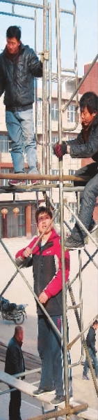 到中学操场后,记者吃了一惊:李永全与其他七位村民全副“武装”,个个手里拿着钳子、扳子。看到记者的表情,李永全说:“他们相当专业,都是建筑队里的好手,搭个架子,那是家常便饭。”