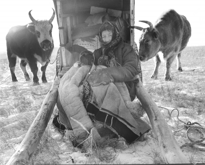 严寒凛冽,呵气成冰,敖日鲁木曹顶着刺骨寒风迁徙。中途,她让牛稍事休息,自己则避在车后躲风。牧民们称敖日鲁木曹为“金牌母亲”,因为她为国家培养出两个摔跤健将。老人自豪地告诉我:“游牧蒙古人天生就是摔跤的料”。阿音拍摄的每一张照片的背后,都有类似这样的一段故事。
