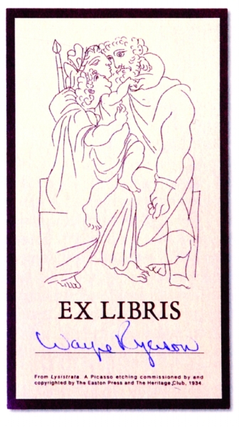 | 小小的藏书票上也不乏大师之作。这款藏书票的设计者是毕加索,画面描绘了一个满脸胡须的雅典战士与妻儿相拥在一起的情景,氛围祥和安宁,简单的线条勾画出一种雕塑的感觉。 |