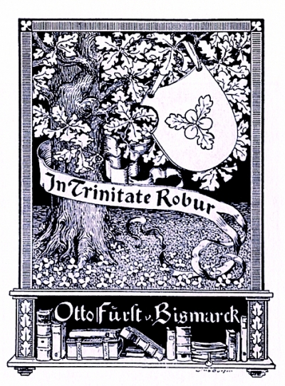| 俾斯麦曾使德国从落后的农业国一跃成为强大的工业国。作为优秀政治家的他在历史、文学、哲学方面也颇有造诣,从他的这枚藏书票里,我们能看到他对书籍的喜爱。 |