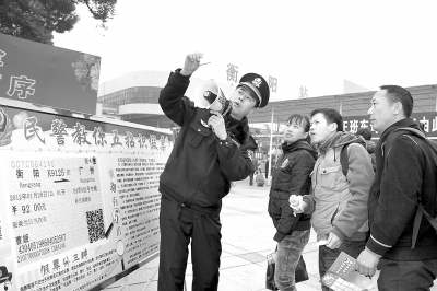 1月29日上午,衡阳火车站迎来节后返程客流高峰,衡阳公安处衡阳所民警联合刑警支队等部门,在火车站广场开展防扒防骗知识宣传。图为旅客围在衡阳铁路公安处衡阳车站派出所龚警官的身边,认真听他讲解如何识别真假火车票。