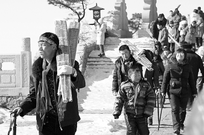 我国有春节登高祈福的传统习俗,每到春节期间,各处名山就格外热闹。日前,记者在泰山上看到,很多百姓扛着大大小小的香烛上山祈福。 本报记者 陈茵摄
