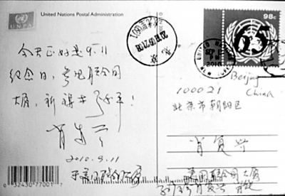 最有意思的是,我自己给自己寄了一张明信片。是前年在纽约,孩子陪我和爱人一起去联合国总部参观,那一天正好赶上是9·11,我买了一张印有联合国大厦前各国国旗飘扬的全景明信片,贴上张纪念联合国成立65周年的纪念邮票,在明信片上写了这样一句:今天正好是9·11纪念日,参观联合国大厦,祈祷世界和平。然后让全家人各自签上自己的名字。因为全家都出来了,家中无人,只好在明信片上写上我自己的名字收。那是给自己的纪念,也是给自己的祈愿。(见左上图)