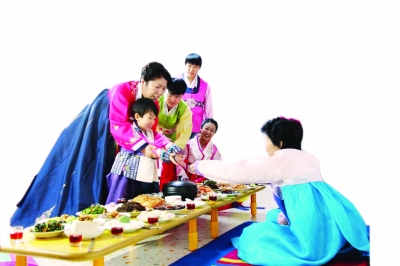 帽儿山风景宜人,林松淑家中更是喜气洋洋。五颜六色的气球、火红的中国结装点出节日的喜气,象征团圆的朝鲜族米糕汤、各式传统泡菜、鲜甜醇美的米酒散发着诱人的香味。林松淑80岁的老母亲张顺福老人高兴地坐在餐桌旁,怀揣红包,等待着晚辈们一一拜年。“这就是朝鲜族的‘岁拜’,是传统年俗。”林松淑解释说。