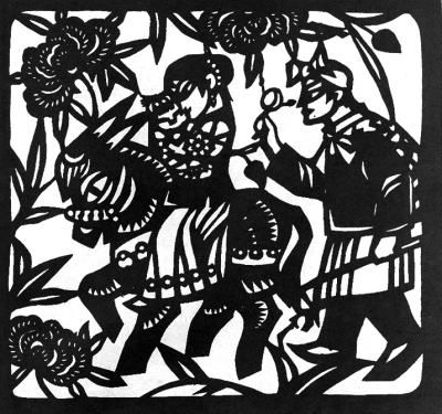 回娘家(剪纸) □ 杜曦明 选自《中国当代剪纸精品展》(中国妇女儿童博物馆,2012年2月18日至27日)