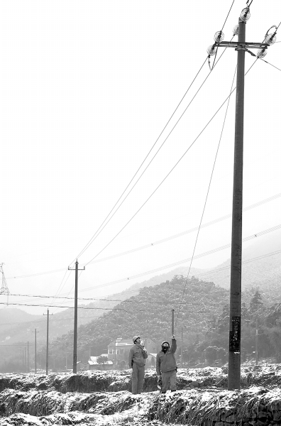 2月28日,电力工人正在巡查线路。当日,受到冷空气影响,浙江北部地区飘起大雪。浙江省德清县西部山区的积雪达到3至5厘米,影响了供电线路的安全运行。德清县供电局派出多个工作小组,踏雪巡查,迅速处理雪后的电力安全隐患,保障线路的安全运行。