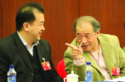 3月5日下午,在分组讨论政府工作报告时,总政歌舞团一级演员黄宏委员(左)和王书平委员亲切交流。