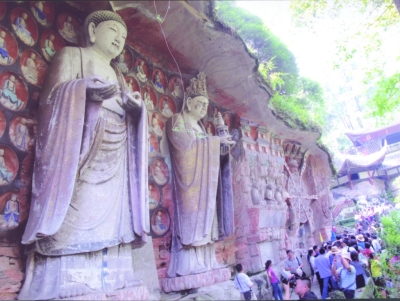 这就是重庆市大足区境内的北山石刻,它是驰名中外的世界文化遗产大足石刻的重要组成部分,始凿于晚唐,历五代,延续至两宋,共有造像近万尊,以雕刻细腻、精美典雅著称。