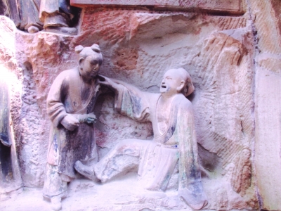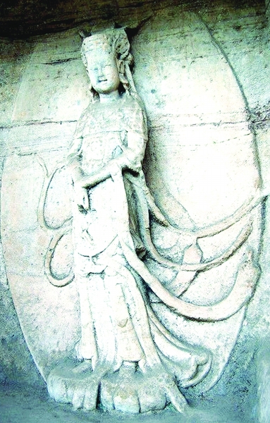 北山石刻集中在500米长的佛湾,这里是观音的大荟萃,数量多,而且特别美,观音全部女性化了。让我们看看北山的美女系列吧:136号转轮经藏窟中,那正在法轮栏杆上嬉戏或手持荷花的女童,一脸稚气、圣洁;125号龛的数珠手观音,像十六七岁的少女情窦初开,媚而不妖;113号龛里跷腿坐在莲台之上的水月观音,浑身都是成熟女性散发出的气息,端庄而亲切;而122号龛的诃利帝母——俗称的送子观音,主管人间婚姻和生育之事的“神”,该是一位老年的女性吧,高贵而和蔼。什么是女性的美?北山石刻诠释得最彻底、最生动。你看,从少年到中年直至老年,她们的身姿那么婀娜,脸庞那么洁净,肌肤那么富有弹性,目光那么纯净,裙裾那么飘逸,平和、安详、慈善、清纯、淡定、悲悯,甚至一个浅浅的微笑,都能让人的心灵震颤呀!普贤菩萨端坐于白象之上,身材修长,面目清秀,嘴角含笑,凝神深思,高雅中透着温柔,文静中含着妩媚,美学家王朝闻称其为“东方的维纳斯”;那尊倾倒众生的媚态观音,活脱脱一位宋朝的美少女,她低眉一笑,就让森严的佛门变得那么有灵气、有生气,变得那么的温润,当年,著名作家汪曾祺先生凝视着她,发出了“与其拜佛,不如膜拜少女”的赞叹。