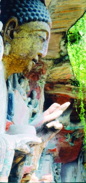 绿树掩映之中,蜿蜒的崖壁之上,密如蜂巢般地雕刻着一龛龛大大小小的佛像,深秋的阳光斜斜地照射进来,照在那些丰润的脸庞上,照在那些慈祥的目光上,照在那些繁复的花冠上,照在那些飘飞的裙带上,照在那些缭绕的祥云上,照在那些楼阁宝树上,一座山因而气韵生动,像一座强大的磁场。
