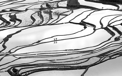 4月9日在云南省红河哈尼族彝族自治州元阳县拍摄的梯田美景。时值初春,位于元阳县哀牢山南部的梯田蓄水充盈,景色迷人。