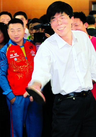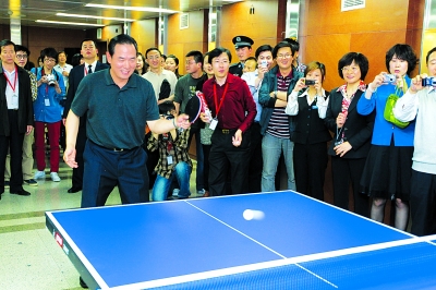 | 国家体育总局副局长蔡振华向本报职工传授球技。 |