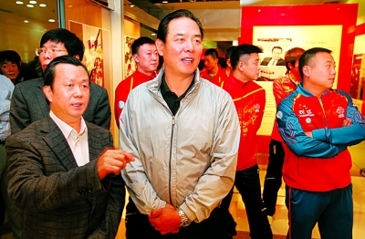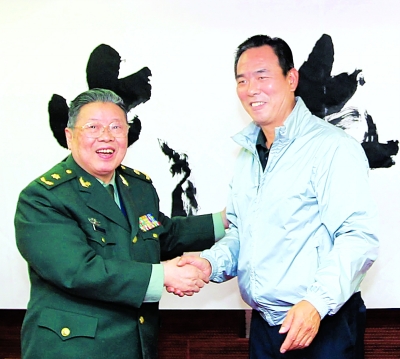 | 著名书法家李铎将军(左)为国家乒乓球队题写书法作品“为国争光”。 |