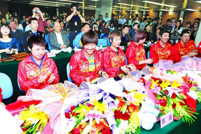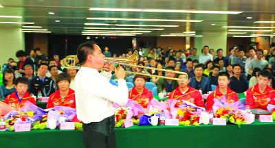 | 国家乒乓球队队员受到报社职工热烈欢迎。 |