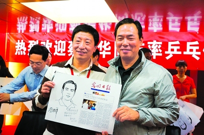 | 本报画家郭红松向蔡振华赠送速写作品,蔡振华欣然签名。 |