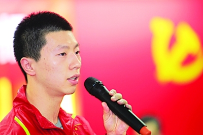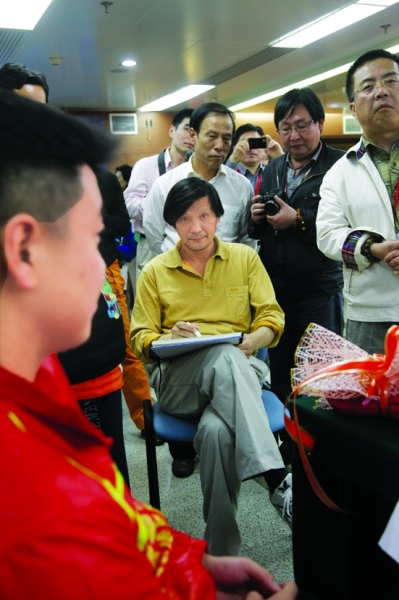 | 世界冠军马龙(上)回答本报记者刘茜提问。 |