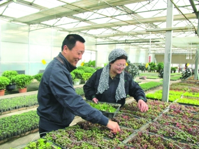 记者随着她走进温室里,看到同事们正在修整小草,她忍不住立即动手干了起来:“今年我们绿化美化任务很重,‘五一’前我们要在街道上摆放15个花堆,栽种5万盆草花,62个大盆花,现在我们正在加班加点,已做好了11个花堆。你看外面,今天还要再做好其余的花堆造型。”