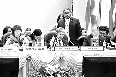 4月27日,在文莱斯里巴加湾,文莱外交和贸易大臣穆罕默德·博尔基亚亲王(前中)和欧盟外交和安全政策高级代表阿什顿(前左)出席第19届东盟-欧盟部长级会。当日,第19届东盟-欧盟部长级会议在斯里巴加湾结束。会议通过了旨在强化东盟与欧盟伙伴关系的斯里巴加湾行动计划,以加强双方的战略合作与对话。 新华社发