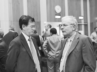 图为4月30日,在奥地利首都维也纳,中国代表团团长、中国常驻维也纳联合国和其他国际组织代表成竞业(左)在《不扩散核武器条约》第九次审议大会第一次筹备会开始前与其他代表交谈。新华社记者 徐亮摄