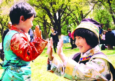 | 五一假期,西藏拉萨市的公园和郊区绿树成荫,气候宜人。城里的人们纷纷走到户外享受阳光和洁净的空气“过林卡”。新华社记者 觉果摄 |