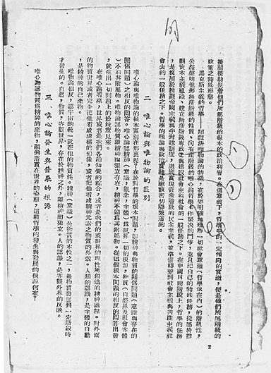 在这个提纲中,毛泽东详细介绍了唯心论与唯物论产生与发展的哲学历史,深入分析了唯物论的科学性以及它在指导中国革命过程中的重要作用,要求广大党员和干部要学会运用矛盾的观点分析和解决问题的方法。提纲共3章16节,约6万字。第一章题为“唯心论与唯物论”,分4节:哲学中的两军对战、唯心论与唯物论的区别、唯心论发生与发展的根源、唯物论发生与发展的根源。第二章题为“辩证唯物论”,分11节:无产阶级革命的武器——辩证法唯物论、过去哲学遗产同辩证法唯物论的关系、在辩证法唯物论中宇宙观和方法论的一致、哲学对象问题、物质论、运动论、时空论、意识论、反映论、真理论、时间论。第三章题为“唯物辩证法”。由于抗日战争的全面爆发,毛泽东未能完全完成此章,只写下“矛盾统一法则”一节。