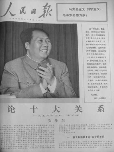1976年12月10日至27日,第二次全国农业学大寨会议举行。《论十大关系》是这次会议集中学习的基本文件。会议闭幕的前一天,即12月26日,是毛泽东诞辰83周年纪念日,《论十大关系》在《人民日报》全文发表。随之,在全国形成了对这一著作的学习宣传活动。1977年《论十大关系》在《人民日报》出现406次,而1957年到2000年,《人民日报》提到十大关系报告也只有597次,可见当时对这一文献的宣传学习确实盛况空前。1977年出版的《毛泽东选集》第五卷收入《论十大关系》,题解中说“毛泽东同志在这篇讲话中,以苏联经验为鉴戒,总结了我国的经验,论述了社会主义革命和社会主义建设中的十大关系,提出了适合我国情况的多快好省地建设社会主义总路线的基本思想。”