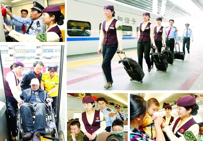 四月二十九日,记者登上了由汉口开往北京西的D126次列车,用相机记录了一位普通列车长刘琼工作的一天。图一:八点十一分,列车准时从汉口出发,刘琼与她的班组又踏上了辛苦的旅途。图二:刘琼与随车机械师乐建刚、乘警长赵焕庆检查随车灭火器。图三:在新乡火车站,刘琼帮助一位坐轮椅的旅客上车。图四:刘琼与同事到车厢巡查列车设施和卫生。图五:遇到老人和小朋友,刘琼总是将开水送到他们手中。