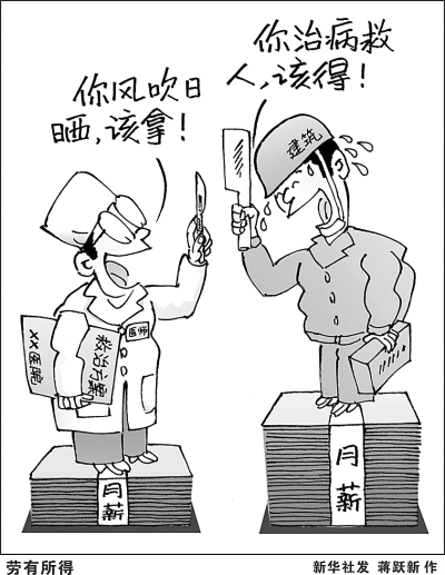 最近,“瓦工月薪8000元”“快递员月薪一万没人干”“月嫂月薪超过一万五”类的新闻特别抓人眼球。五一劳动节期间,此类新闻又开始“刺激”人——原本令人羡慕的白领咋就不如蓝领了呢?其实,月嫂、白领、科学家是相互依赖、支持的,不该以一月收入论高低。请给拿高薪的蓝领更多理解,因为,生活离不开他们。新华社发 蒋跃新作