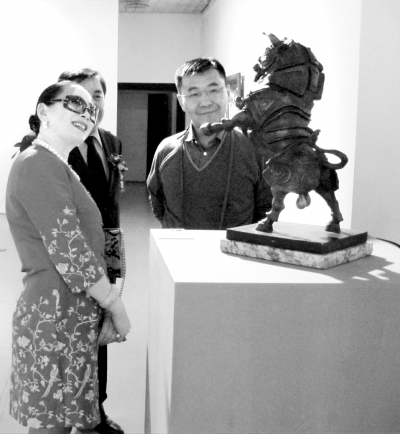 “今日蒙古国”艺术展日前在北京皇城艺术馆举办。展览包括50幅摄影、40幅绘画及3件雕塑作品。图为观众在观看雕塑作品。本报记者 于园媛摄