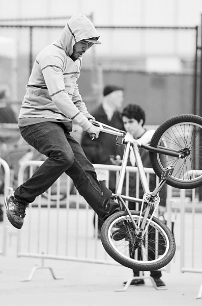 5月3日,一名自行车爱好者在纽约自行车博览会上表演自行车特技。当天,2012年纽约自行车博览会开幕并免费向市民和游客开放。博览会展示了功能多样的自行车及配件,吸引大批市民观看和体验。 新华社发