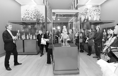 5月3日,在英国剑桥,菲茨威廉博物馆馆长蒂莫西·波茨博士(左一)向媒体介绍此次汉代文物展。近日,中国汉代价值连城的金缕玉衣和陶俑进入了英国学术之城剑桥的菲茨威廉博物馆,向英国参观者展示中国汉代墓葬精华。此次展览共有来自中国徐州博物馆和西汉南越王博物馆的文物300余件。展览将从5月5日正式开始,持续到今年11月11日。