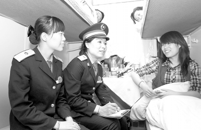 连日来,武汉铁路局广泛开展的“服务旅客 创先争优”活动,不仅提升了铁路客运服务水平,更让旅客感受到了如家般的温暖。图为在北京西开往汉口的Z77次列车上,列车长李景娥与列车员一起在卧铺车厢内向旅客征求意见。