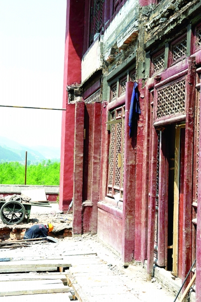 避暑山庄及周围寺庙文化遗产保护工程正在进行。图为5月8日,在河北承德外八庙之一——班禅行宫内一处古建筑,工人正在施工。