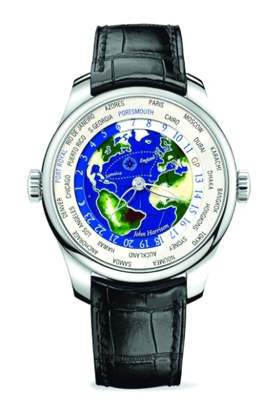这款珐琅表的设计灵感来源于钟表大师约翰·哈里森。表盘上精美的大西洋海图,细致描绘了从英格兰到牙买加的航海路线。表盘上蓝色的海洋与绿色的陆地色泽鲜明,银色的航海路线精细锐利,而精巧镂雕的指针,在海洋与陆地间掠过,庄重优雅,匠心独具。