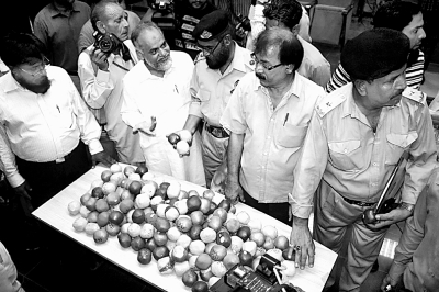 5月11日,在巴基斯坦南部城市卡拉奇举行的新闻发布会上,海关人员展示缴获的毒品。巴基斯坦海关日前在卡拉奇截获一批总重达125公斤的海洛因。 新华社发