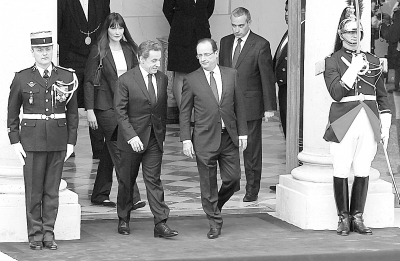 5月15日,在法国巴黎总统府爱丽舍宫,离任的法国总统尼古拉·萨科齐(中左)在当选总统奥朗德(中右)的陪同下离开爱丽舍宫。当日,法国总统权力交接仪式在爱丽舍宫举行,萨科齐向奥朗德正式移交总统权力。新华社发