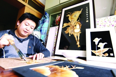 家住河北省张家口市桥东区的残疾人孙春宝,自强不息,学习创作麦秸画、葫芦烙烫艺术,自谋生路,并达到一定的艺术水准。他的作品在河北省旅游产品大赛中获得银奖,并在其他各种工艺美术赛事中获得奖项。图为孙春宝正在创作麦秸画。 本报记者 刘新武摄