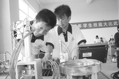 山东省无棣县职业中专日前举行2012年学生技能大比武。多年来,学校先后投资1700余万元装备了钳工、电焊工、车床和电子电工一体化等实习实训室,全方位提高学生的实际操作能力,让学生未走出校门就成为社会抢手的“香饽饽”,有力地促进了学生多元就业。图为机电专业的学生们正在紧张地进行机械手操作比赛。